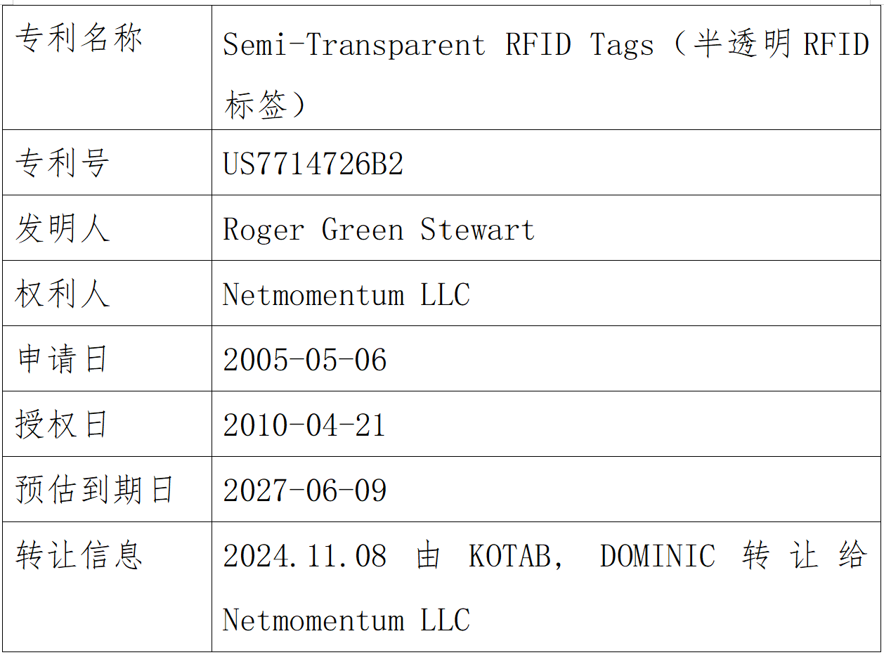 综上所述,Netmomentum提起专利诉讼呈高频态势,主要针对其US7714726B2发明专利进行起诉,受理法院集中在美国德克萨斯州东区联邦地区法院,最快在立案之日起27天内结案。