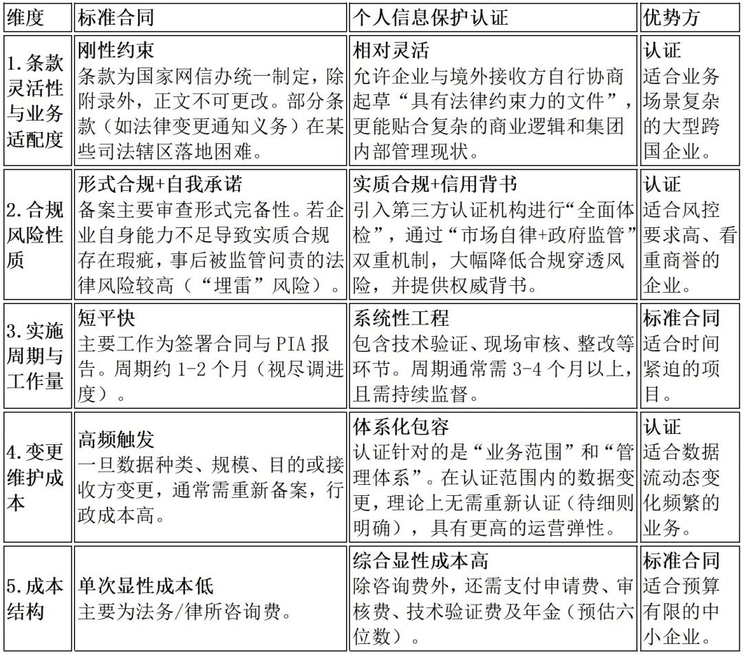 此前,标准合同凭借其“备案即合规”的确定性,成为企业的首选。然而,《认证办法》的发布标志着认证路径从“理论可行”转向“实践落地”。这一变化要求企业必须重新审视自身的跨境数据治理策略:是追求短期的备案效率,还是构建长期的认证体系?