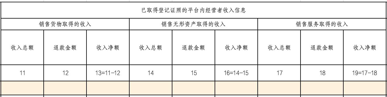 互联网平台企业应当填报《平台内的经营者和从业人员收入信息报送表》,报送平台内的经营者和从业人员上季度的下列收入信息: