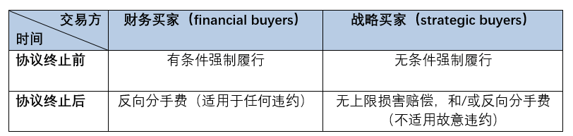 协议终止后的救济措施主要有两种:损害赔偿(Damages)或反向分手费(Reverse Break-up Fee)或两种措施的组合。采用哪种救济措施也与买家性质有比较大的关系。通常而言,战略买家更可能同意损害赔偿或/和反向分手费,但财务买家一般倾向于不接受无封顶的损害赔偿。