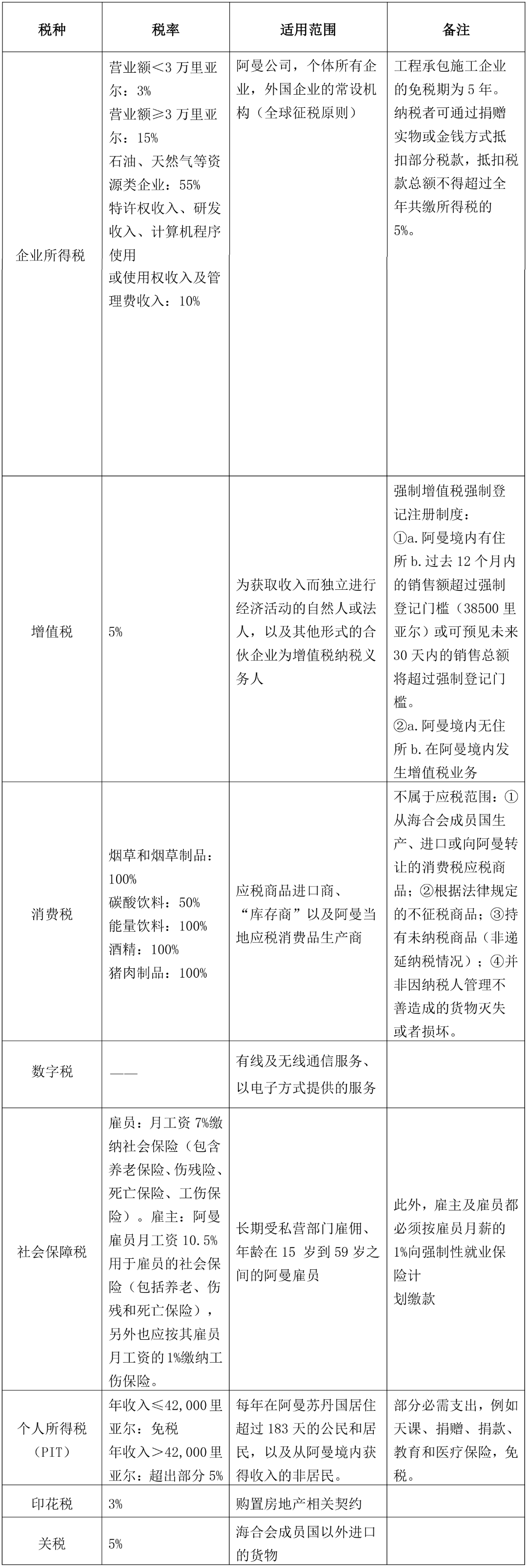 阿曼税收体系较简单,征税税种少而简单,企业赋税水平低。但阿曼税制正在改革,主引入个人所得税的同时,针对企业的免税期政策逐步取消。根据《所得税法》,在阿曼开展业务的公司主要需缴纳企业所得税(CIT)、增值税(VAT)、消费税、数字税等。