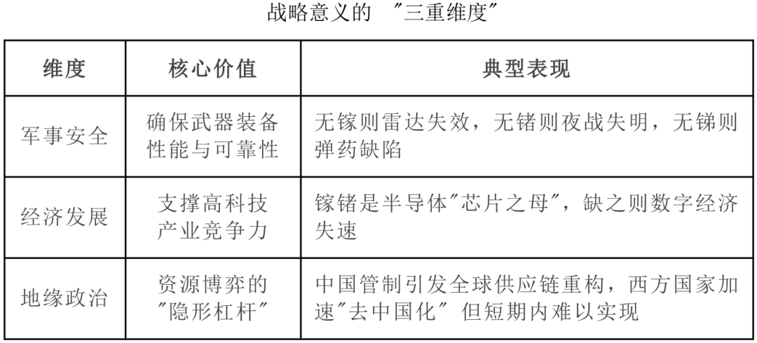 基于当前科技、军工发展技术路径和国际形势,镓、锗、锑已经从工业原料升级为大国博弈的“战略武器”,是比稀土更稀缺、战略价值更高的"工业维生素",被誉为高科技领域的"隐形支柱”。它们“用量少、作用大、不可替”,是确保国防安全、支撑经济发展、影响地缘政治的“隐形王牌”。