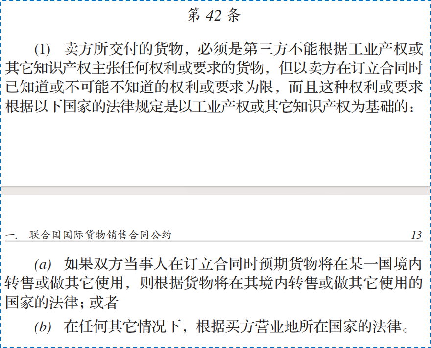 - 其一,根据CISG第6条规定排除适用需意思表示明确,故若需排除CISG第42条的适用,应作出明示约定:“本合同不适用《联合国国际货物销售合同公约》规定,双方就与本合同货物相关的知识产权权利义务,均适用某国/地区法律调整。”