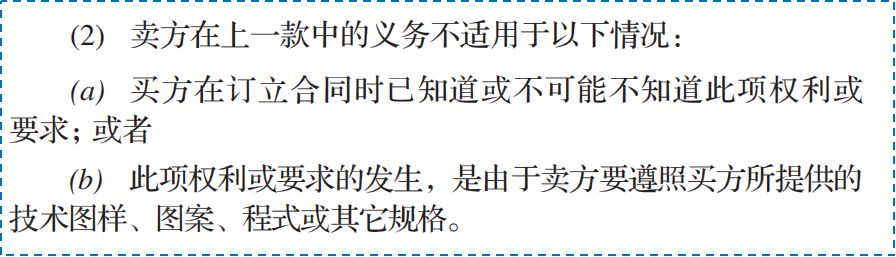 根据CISG第42条第(2)款的规定,卖方在前述知识产权担保义务项下存在两种免责情形:一是买方在订立合同时已知道或不可能不知道货物相关的第三方提出的知识产权权利或要求;二是第三方的知识产权权利或要求系因卖方遵照买方所提供的技术图样、图案、程式或其他规格而产生。简言之,只要满足买方事先知晓相关权利主张,或是卖方严格按照买方指示进行货物生产这两类情形之一,卖方即可免除相应的知识产权担保义务。