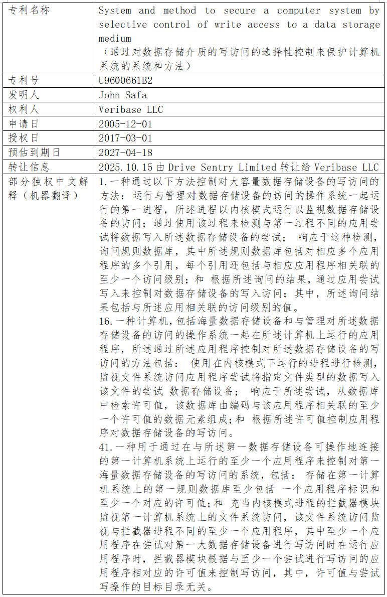 Veribase是一家位于美国新墨西哥州的企业,成立于2025年5月15日,目前在美国共有6件发明专利布局,其中涵盖1件有效专利和5件失效专利,皆为2025年10月15日从Drive Sentry Limited受让所得。原告专利布局主要涉及电数字数据处理,具体信息详见附件2。