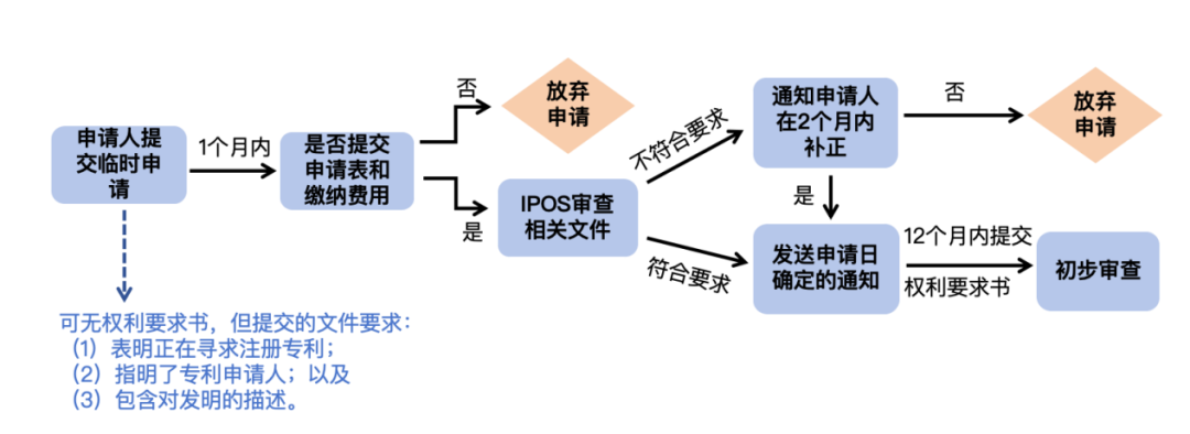 IPOS会在确定专利申请日且申请人在规定期限内支付了申请费并提交了权利要求书之后,对提交的申请进行初步审查,初步审查需保证优先权主张符合规定、附图或说明书内容无缺失,以及申请符合全部形式要求。