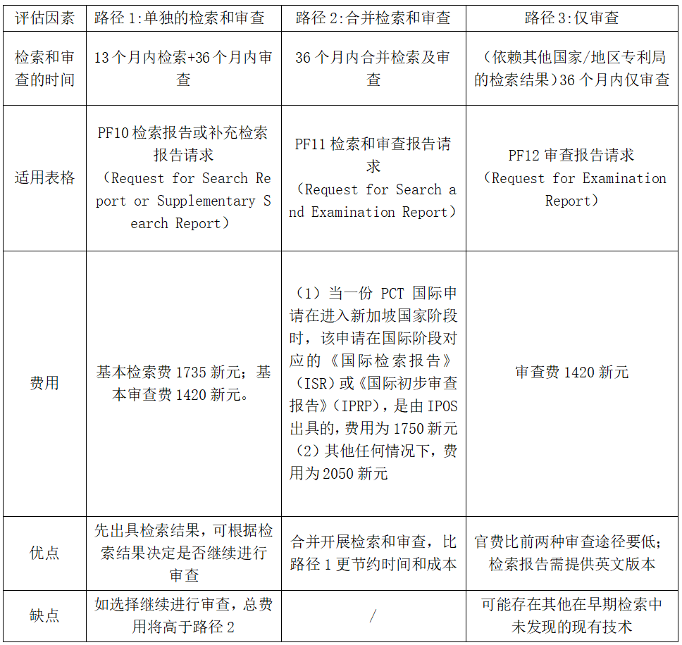 依据 IPOS相关规定,申请人可结合国外检索结果、审查结果的获取情况及成本等因素,综合评估后选择适用的检索与审查路径,具体路径详见下表:
