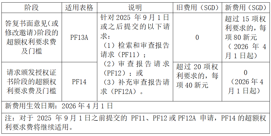 2.自2026年4月1日起,针对于 2025年9月1日或之后提交的 PF11、PF12和PF12A(补充审查申请表)申请,其超额权利要求费的支付时点将从PF14(授权阶段)变更为PF13A(答复书面意见阶段)。