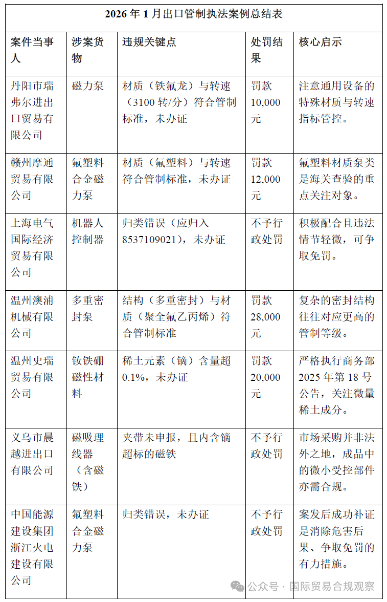 本月的执法案例主要集中在通用工业装备(泵类)、战略性原材料(稀土、石墨)以及高精度加工设备(机床)三大领域。近期的执法结果依然具有“宽严相济”的鲜明特征:对于核心技术指标超标的违规行为予以重罚,而对于非主观故意且配合调查的企业,则依法适用“不予行政处罚”。笔者将结合具体案情,从违规特征、技术指标认定、执法裁量权运用及合规义务四个维度进行详细分析。