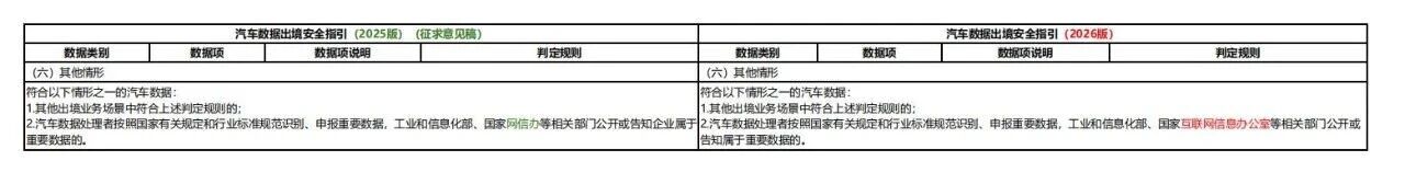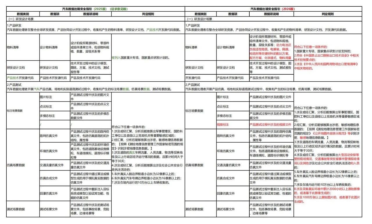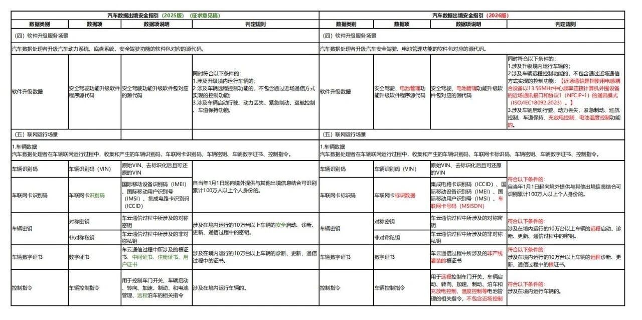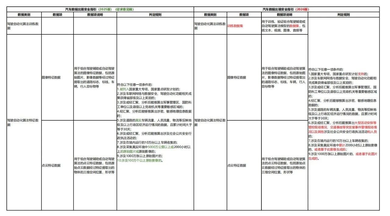 2026版较2025版征求意见稿细化重要数据项、判定规则、出境流程等,并强化动力电池、安全漏洞要求,既保障汽车数据出境安全,也通过明确豁免情形和流程优化,提升企业出境便利化水平,推动汽车产业数据跨境流动“安全与效率”平衡。