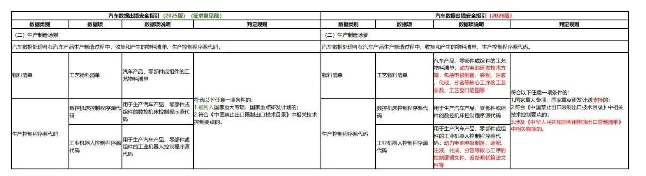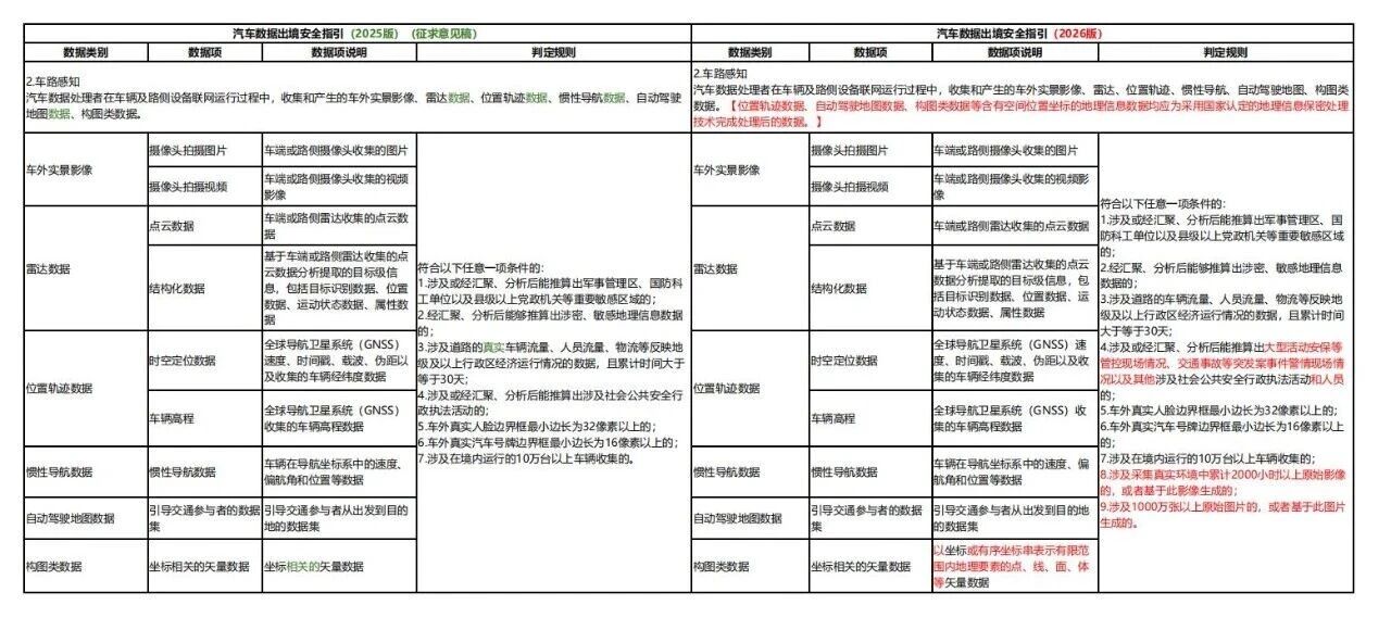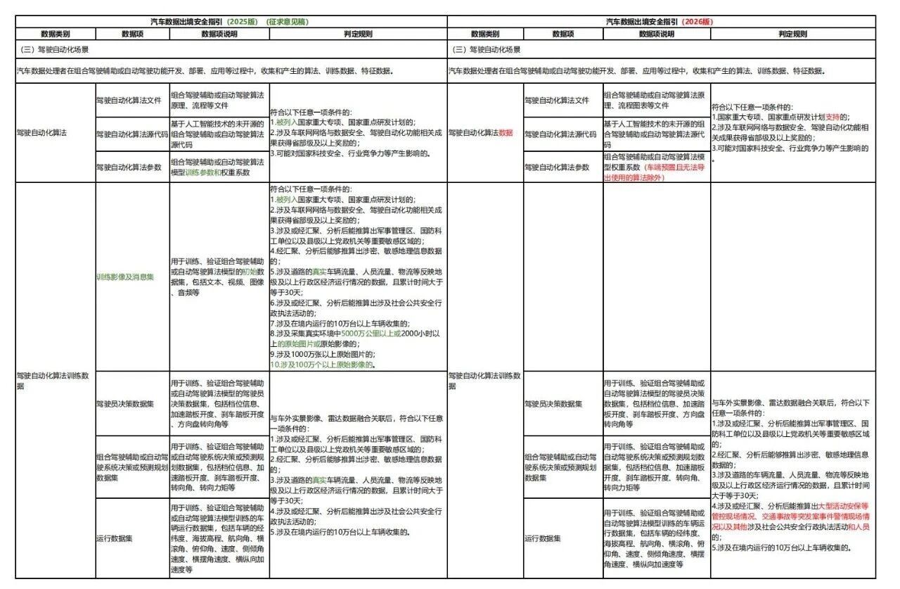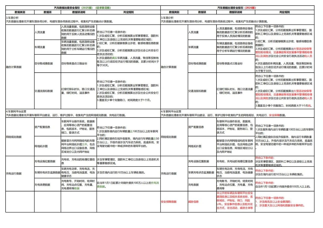 2026版较2025版征求意见稿细化重要数据项、判定规则、出境流程等,并强化动力电池、安全漏洞要求,既保障汽车数据出境安全,也通过明确豁免情形和流程优化,提升企业出境便利化水平,推动汽车产业数据跨境流动“安全与效率”平衡。