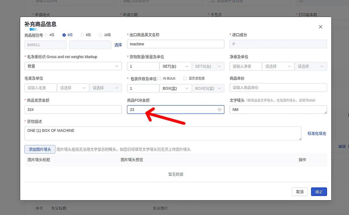 填写步骤为:如没有添加商品,点击“商品信息-添加商品-商品FOB金额”,如已经添加商品,点击“商品信息-编辑-商品FOB金额”修改。