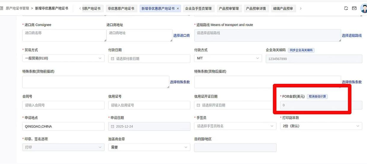 二是手动输入。点击FOB金额旁边的“取消自动计算”,手动输入。