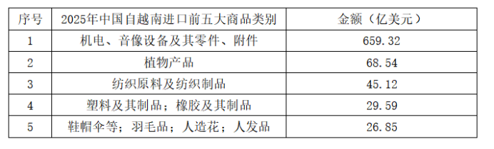 中国自越南进口同样以机电产品为核心,前三大进口商品为平板显示模组、集成电路 和自动数据处理设备零附件。电话设备、水果、木制品等也是主要进口商品。中国向越南出口的前五大商品类别按照金额从高到低依次是:机电、音像设备及其零件、附件;纺织原料及纺织制品;贱金属及其制品;塑料及其制品,橡胶及其制品;化学工业及其相关工业的产品。金额如下: