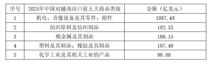 从货物贸易商品结构看,机电产品和高科技组件是双边货物贸易的最主要构成部分。中国对越南出口以中间产品和生产设备为主。前三大出口商品为集成电路、电话及通讯设备和平板显示模组。钢铁产品、蓄电池等也是重要出口项。2025年,中国自越南进口的前五大商品类别按照金额从高到低依次是:机电、音像设备及其零件、附件;植物产品;纺织原料及纺织制品;塑料及其制品,橡胶及其制品;鞋帽伞等、羽毛品、人造花、人发品。金额如下:
