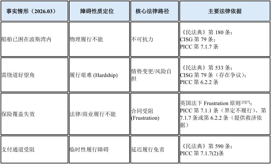 【表1:2026年霍尔木兹海峡危机履行障碍分类及依据】