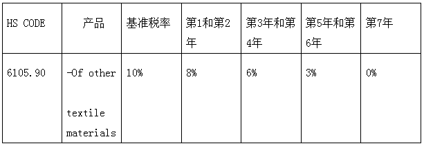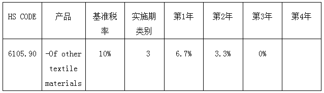 从表中看出,该产品的基准税率为10%,降税类别为3年,协定生效首年(2015年12月)降税至6.7%,第3年则降为零。降幅还是很大。我们再看一下RCEP下的关税减让情况。