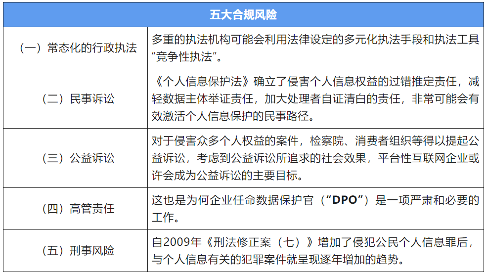 我们认为,在《个人信息保护法》下,企业未来将面临五大合规风险: