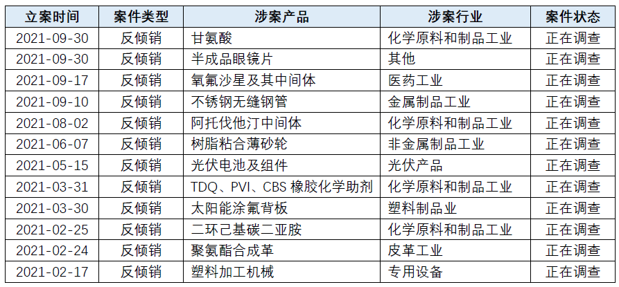 2021年,印度对中国发起12起反倾销调查,且集中在前三季度立案,其中,化学原料和制品工业占总调查量的三分之一。