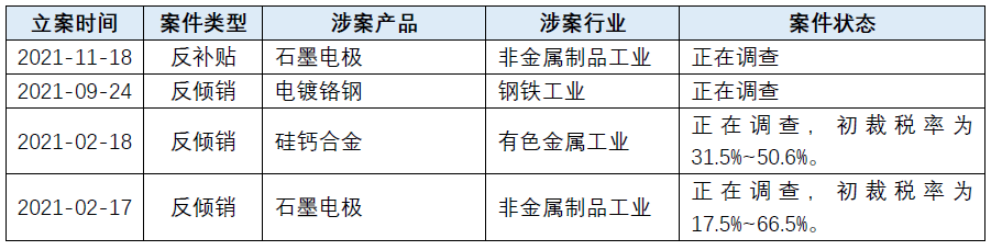 2021年,欧盟对进口自中国的石墨电极、电镀铬钢和硅钙合金产品发起4起贸易救济调查。其中石墨电极是自2010年反倾销终止调查后再度重新立案。本次石墨电极反补贴立案申请是在反倾销初裁预披露之后才提出,因此反补贴比反倾销晚了九个月才立案。