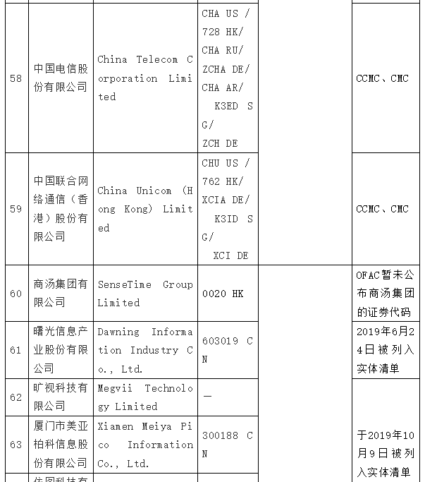 1、 被列入第14032号EO附件的(第一批59家)企业;