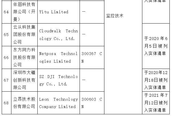 - 美亚、依图、云从、东方网力、大疆、立昂共计6家公司被制裁的原因系目前/曾经在中国监控技术领域运营;