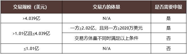 美国法下的合并管制主要由1976年颁布的《哈特-斯科特-罗迪诺法》及其修正案(HSR法案)规制,并由美国联邦贸易委员会(FTC)和美国司法部反垄断局共同负责对相关并购交易进行事前审查和事后监管。一项并购交易是否需要进行反垄断申报应根据交易的规模和交易方的体量进行双重标准判断,最新的门槛金额参见以下表格[6]: