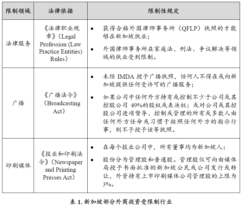 (1) 了解新加坡外商投资限制性行业。如在新加坡投资广播、媒体、电信等领域都可能面临法律限制或行业壁垒,投资者应具体判断投资领域所面临的市场准入障碍。