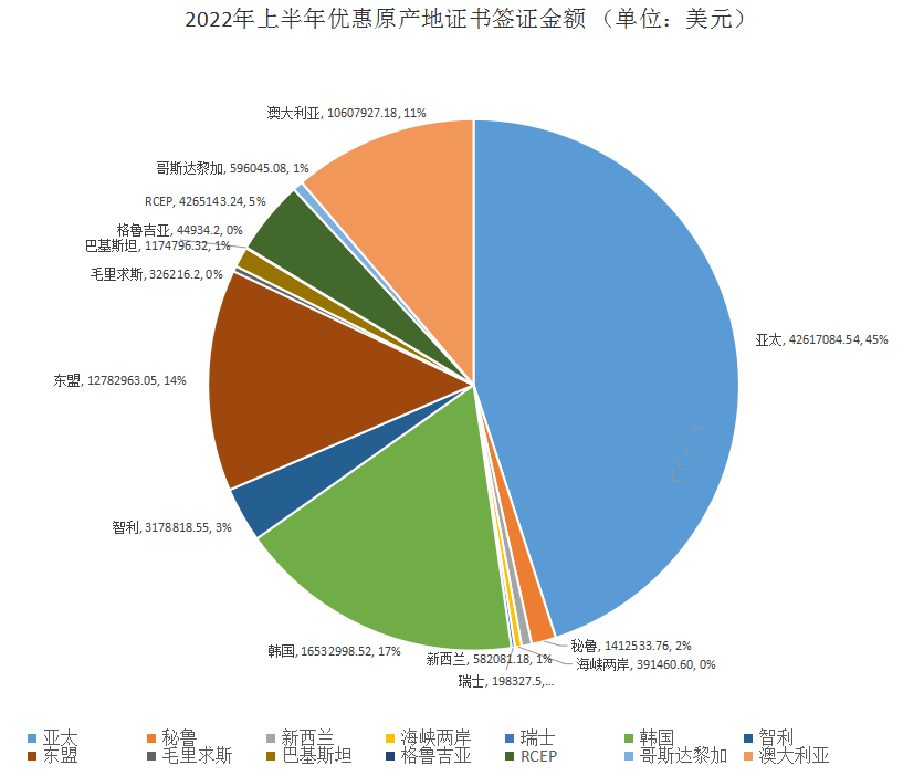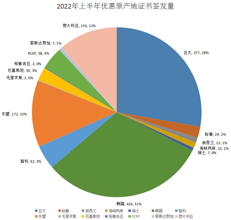 从优惠原产地证书签发量看,前四位的分别为中国—韩国原产地证书426份、亚太原产地证书377份、中国—东盟原产地证书172份、中国—澳大利亚原产地证书154份,共占优惠原产地证书签发总量的83.08%。