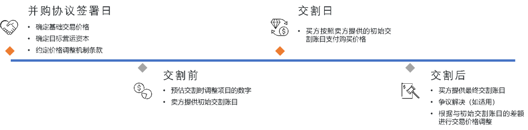 在交割经过一段时间(通常是60天或者90天)后,买方需要向卖方提供最终交割账目,其内容为关于该等调整项目在交割时准确数额的核实和计算,相对于初始交割账目通常会有调整。如卖方确认买方的计算无误,交易双方便可以根据最终交割账目中的数字对购买价格作最终调整;但是,如果卖方对买方出具的最终交割账目持有异议,则双方应根据并购协议中约定的争议解决机制善意协商或是提交第三方来进行评判和决断。