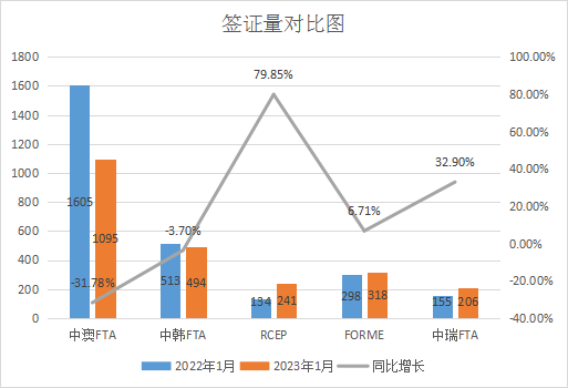 1月优惠证书小幅下降,其中主要为中澳证书大幅下降,签发1095份,同比下降为31.78%;中韩FTA证书与同期相比小幅下降3.7%;东盟证书同比小幅增长6.71%;中瑞FTA证书本月涨幅较大,签发206份,同比增长32.9%。1月RCEP签单241份,与去年刚生效1月相比上涨79.85%,其中有96.3%签往日本。